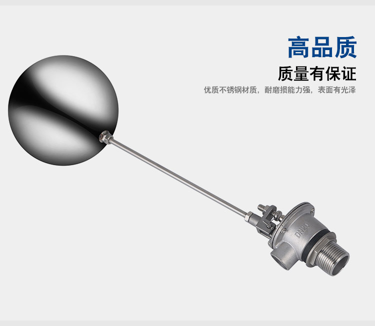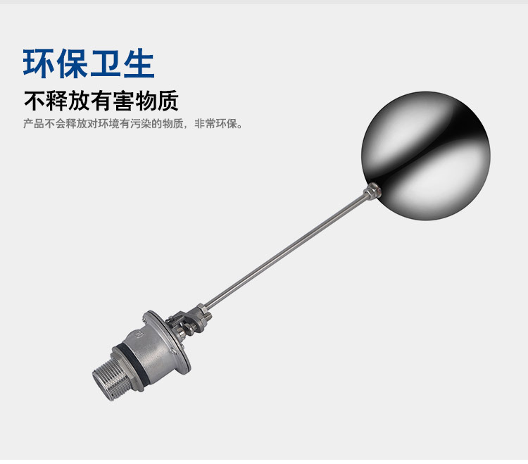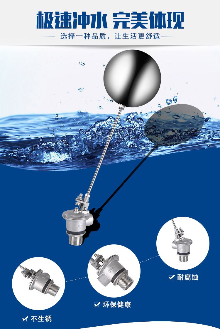 當(dāng)水塔內(nèi)水面下降時(shí),浮球下落,利用水管內(nèi)水的壓力,將閥體里的密封硅膠柱塞打開(kāi),閥體開(kāi)啟供水,當(dāng)水塔水位上升時(shí),浮球上浮,連桿帶動(dòng)柱塞,硅膠體密封進(jìn)水孔,閥體停止供水.